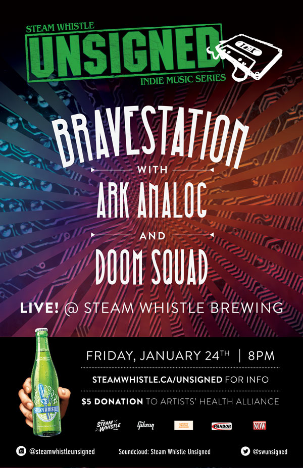 We’re giving away 2 tickets to the Steam Whistle Unsigned concert featuring Bravestation, Ark Analog and Doom Squad along with refreshment tickets and Steam Whistle merch (Steam Whistle Unsigned shirt, brewery tour passes, opener, glass).