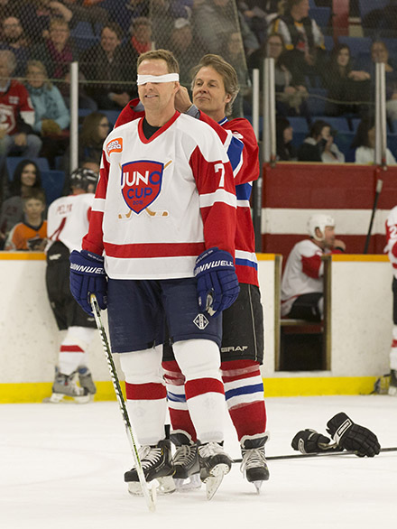 Rocker Jim Cuddy blindfolds NHL great Gary Roberts during the skills competition at the 2015 JUNO Cup. (Photo: CARAS)