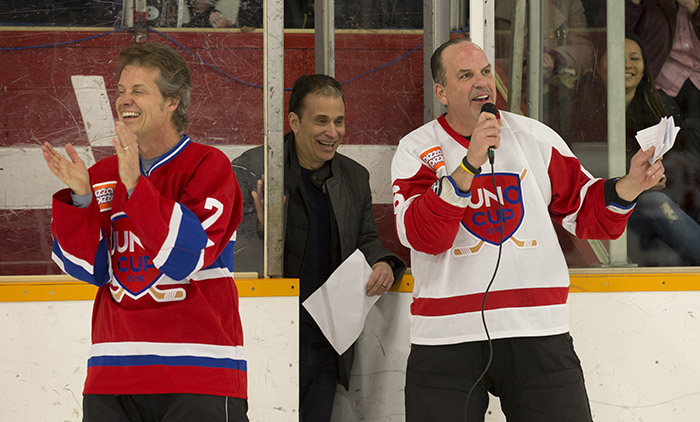 Rocker Jim Cuddy applauds an NHL great during a singing competition at the 2015 JUNO Cup. (Photo: CARAS)