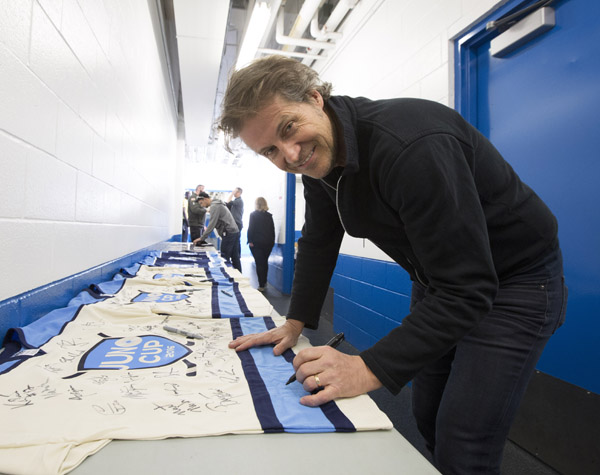 Jim Cuddy signing sweaters before the start of the JUNO Cup at Max Bell Arena in Calgary on April 1, 2016. (Photo: CARAS)