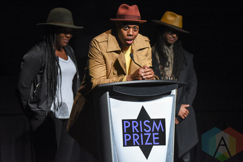 Cazhhmere, Kardinal Offishall and RT present the Special Achievement award during the 2016 Prism Prize gala at the TIFF Lightbox in Toronto on May 15, 2016. (Photo: Jamie Espinoza/Aesthetic Magazine)