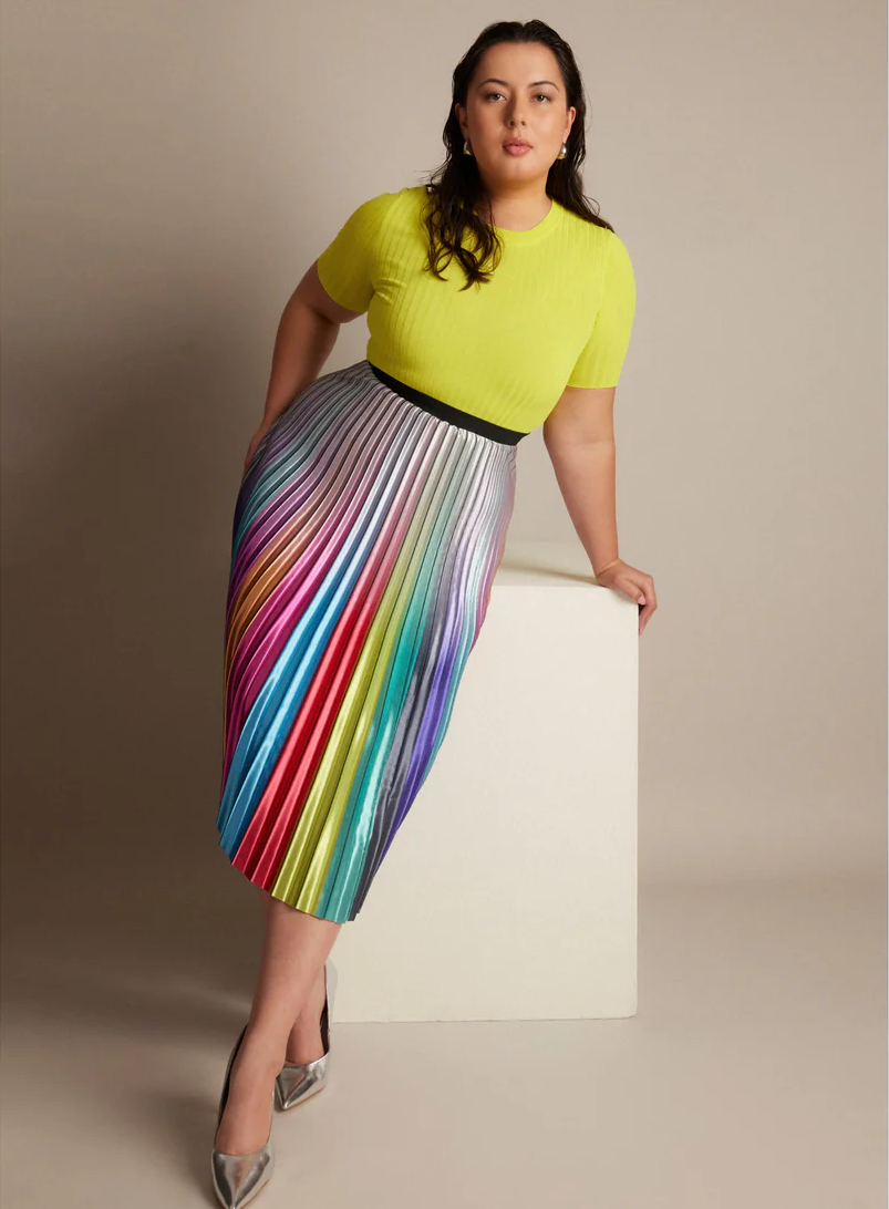 This beautiful pleated skirt comes with an elastic waistband, and serves as a colourful below-the-knee wrap skirt that is a versatile statement piece.