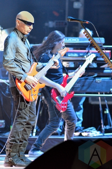 Joe Satriani (left) and Bryan Beller (far right). (Photo: Steve Danyleyko/Aesthetic Magazine Toronto)